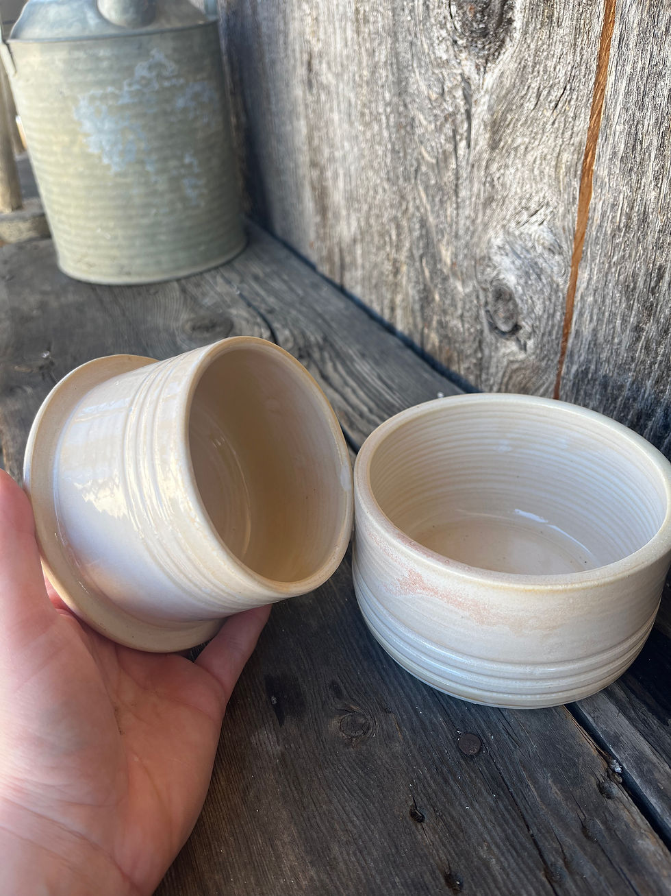 I was born and raised in the Mannville AB area. After high school, I moved to Saskatoon, SK and completed a Bachelor of Science in Agriculture as well as a Master of Science; both majoring in Food Science from the University of Saskatchewan. It was during University when my mom suggested that I find a creative outlet to help express myself and relax, so I signed up for a few pottery classes in Saskatoon, and I loved it. After I finished my Masters Program, I moved back home to work on my family farm. While my day to day life changed dramatically by going from city life to farm life, I knew I wanted to pursue my new hobby further. Once I was situated back at home, I joined the local pottery guild to further hone my skills and become inspired by the other crafters around me. Recently, I met someone wonderful, and we have decided to start a family together!